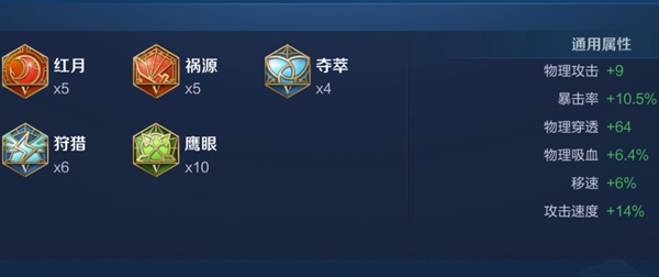第一套铭文:5红月+5祸源、4夺萃+6狩猎、10鹰眼