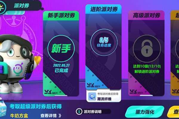 不同于蛋仔挑战,派对券挑战更类似游戏中的“考级”。完成不同阶段的派对券挑战,也可以获得不同数量的潮流纤维,入口与蛋仔挑战在一起,都在游戏内-右上角模式选择-然后选择“蛋仔挑战”;