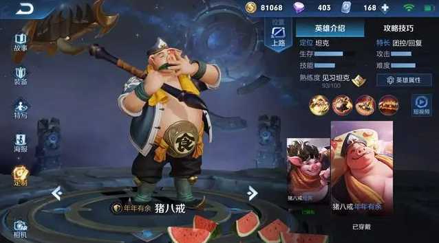 王者荣耀猪八戒是一位坦克边路,具有超强的先手开团能力,控制也很足,坦度也够,还有回复续航能力,小技巧很多,可玩性非常的高,个人感觉这个英雄是非常强的,猪八戒由于技能的特殊性,所以猪八戒在战斗的过程中主要以近身肉搏和防守反攻为主,在技能的连招上也有非常多的注意技巧。